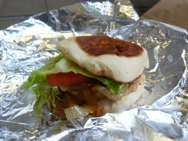You get ground white organic turkey, and the romaine, tomato and griddled onions on a portuguese muffin. You want cheese? That’s $1.50 extra, so I opted to just go with the base model supplemented later with ketchup.