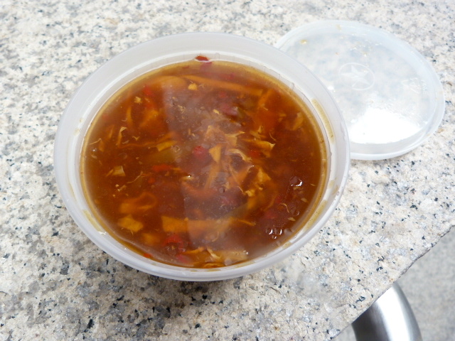 You know what else wasn’t half bad? The hot and sour soup. It had some unidentifiable vegetable pieces in there, along with strips of tofu. Maybe my standards are low, but it was better than the usual default of Chinese takeout soup that tastes vaguely of chicken.