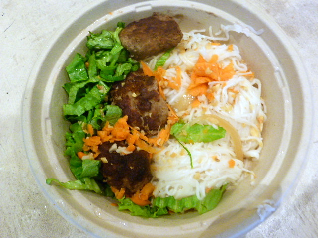 My first thought was this wasn’t a ton of food, and it’s not, although I was full after eating the bowl. The turkey burgers were not as dry as I feared, although they lacked any seasoning. The carrot lime relish was more like the pickled carrots you get on a banh mi and the toasted garlic was minimal. Basically, this was some turkey burgers atop a pile of rice noodles that were a tad overcooked and kind of mushy.