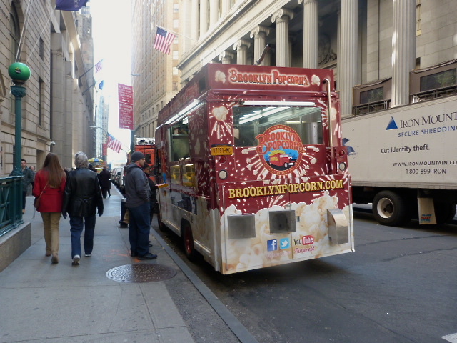 Do you want to feel like you’re at the movies at lunch time? Well, there’s a truck called Brooklyn Popcorn that’s been regularly parking on Wall St. and in Soho on Prince St. selling different flavors of popcorn: Caramel, cheddar, butter, dill pickle, parmesan garlic, they have them all! Whether or not the kernels at this Brooklyn-based truck are hand-harvested and popped with artisanal air by men with beards is up in the air.