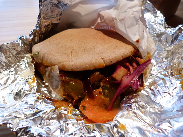 They really crammed a lot into this sandwich, although I wished I’d asked for a few more vegetable toppings. What was in my pita was so tasty that I powered through the whole thing even though my stomach told me not to. The crisp-skinned chicken, although tasty when I got a bite, took a back seat to the salads and vegetables within (the Spanish eggplant and carrots were standouts). I think if I went back I would just get a vegetarian sandwich and save a couple of bucks.
