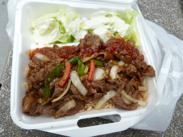 The menu is awesomely straightforward: Marinated pork ($6), chicken ($5) or bolgogi ($7), spicy or not. There is no sandwich option, only over rice alongside a pile of iceberg lettuce doused with dressing.