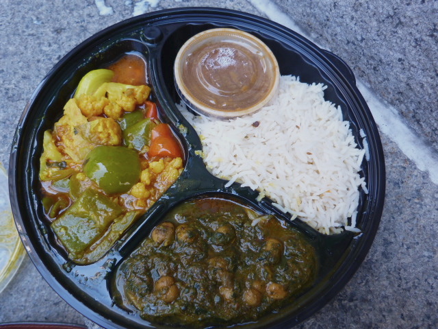 The curried vegetables were simple and tasty, if a little oily. Cauliflower and bell peppers comingled in the slightly spicy sauce, trumping the mild spinach and chickpeas next door in terms of flavor. The basmati rice was only OK, but when paired with the little cup of thick, bean-laden dal was pretty great.