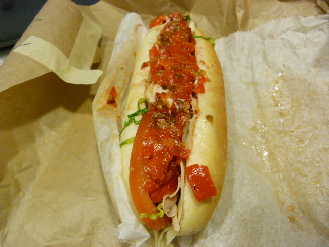 I’m not lying when I say the entire 30 minutes or so I was at Dave’s Hoagies, I was the only female customer to be seen. Are dudes the only ones who like Philly-style sandwiches? I ordered up my hoagie with turkey ($10.50 plus tax) minus the chopped artichoke hearts.
