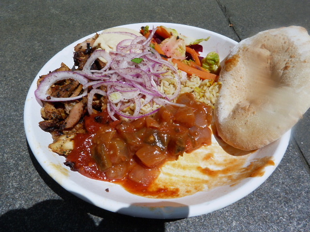 I’m not going to judge my lunch here too much because it was a training exercise (and, full disclosure, free food), but all in all my rice plate was good. The chicken roti earns points for have a nice char and grilled flavor from the rotisserie, but I’d have to say the white meat kebab looked pretty great as well. I also got a falafel ball that was fresh from the fryer while waiting in line and enjoyed the flavor that was heavy on cumin.