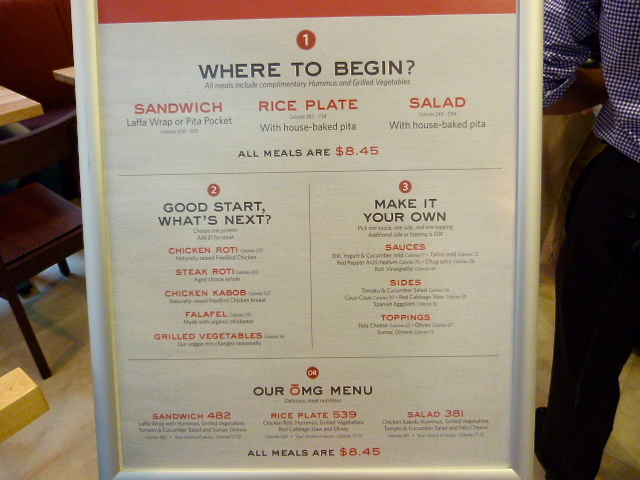 All of the options here are the same price of $8.45 whether you get a pita sandwich, laffa wrap, salad or rice plate. You choose chicken or steak roti (aka, shawarma), chicken kebab, falafel or roasted vegetables, a side (all come with hummus and roasted vegetables), a sauce and a topping of feta, olives or sumac onions.