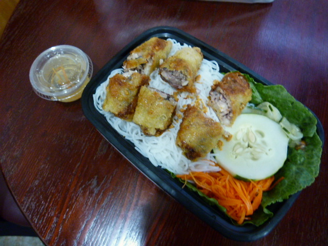 There are several options for lunch including various proteins or vegetables over rice or vermicelli, and you get a can of soda or seltzer with your order. I ordered the bun (room temperature vermicelli noodles) with Vietnamese pork spring rolls on top. I also saw a guy’s order of grilled, thinly-sliced skewers of beef over vermicelli and it looked mighty tasty.