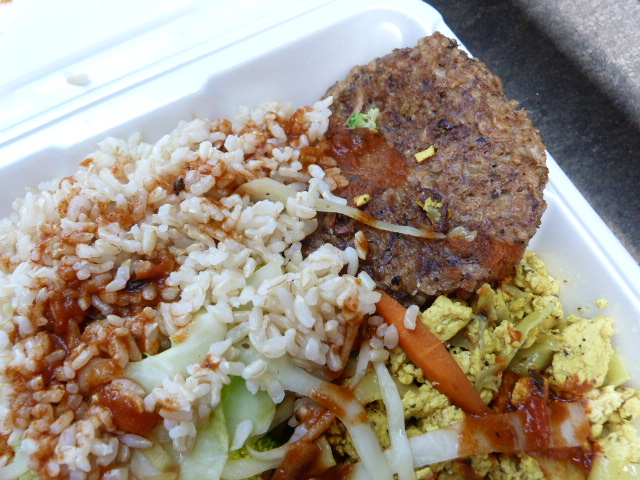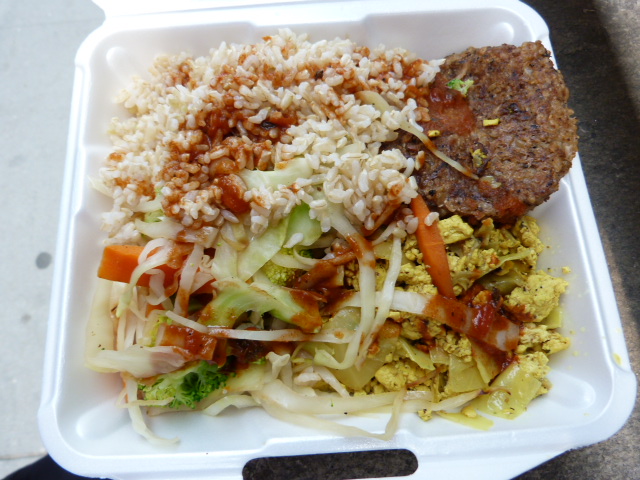 You get to choose four items if you get the platter, and although I was disappointed that they didn’t have my favorite – mashed yams – I soldiered on. Into my container went a veggie burger fresh off the griddle, brown rice, vegetables and tofu scramble. I restrained myself from getting the vegetarian chili again, although I endorse it.