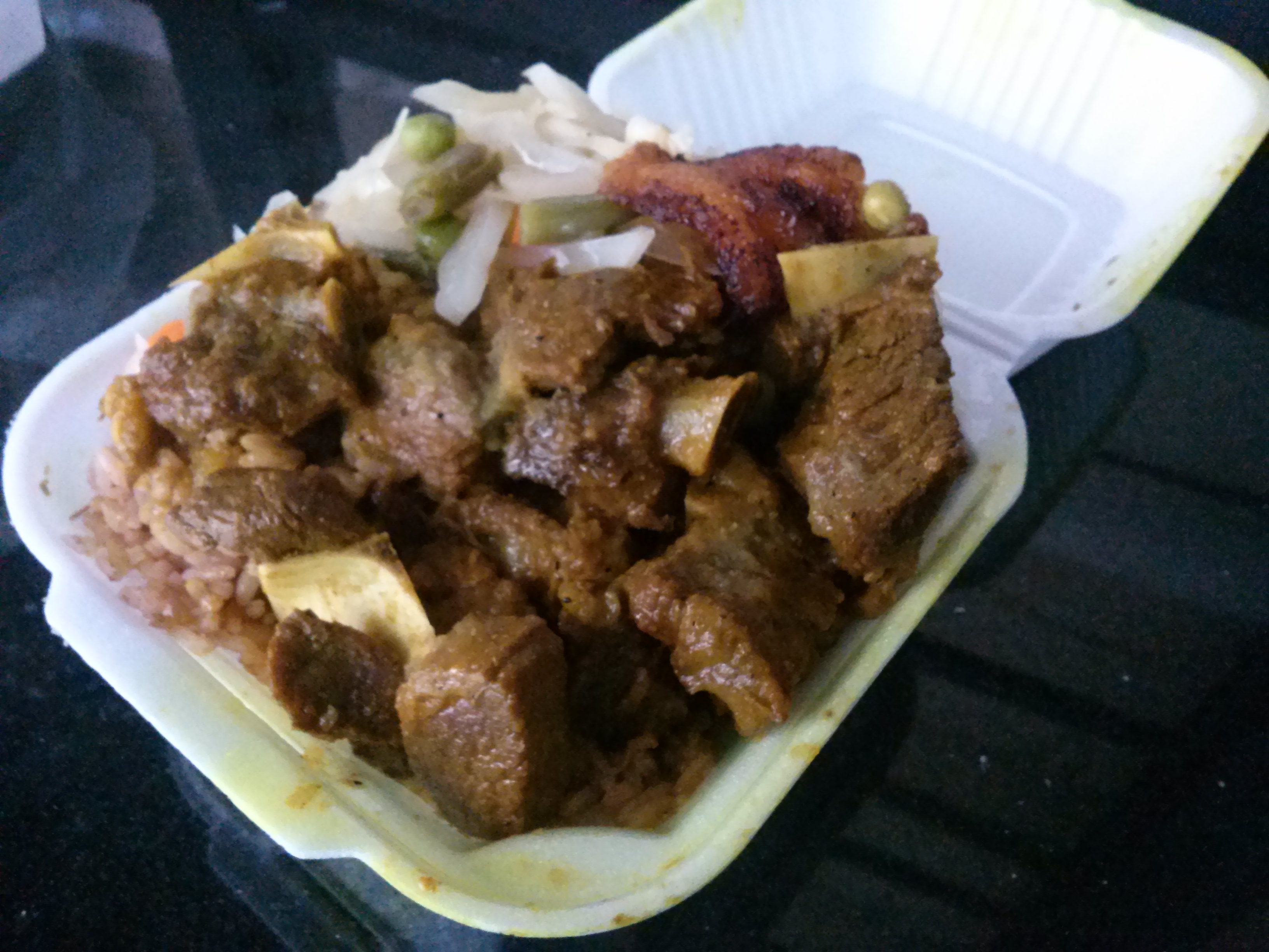 The peas and rice were soaked with curry from the goat and therefore was not dry as is sometimes the case with the dish. You also get a chunk of fried plantain and some cabbage and other veg which was the weakest part of the meal for me.