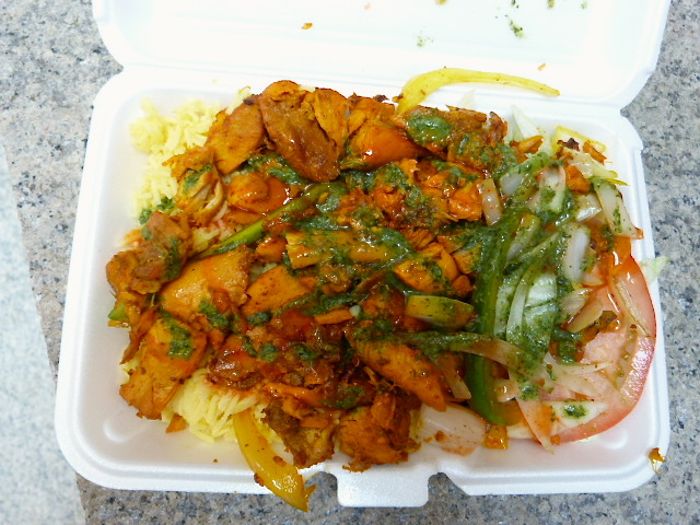 I went for the chicken tikka ($5, but listed on the menu as $6) over rice with red and green sauce. I got a little smile when I asked for the green sauce which was wordlessly squirted all over my chicken. Later, when I took my first bite of chicken I realized that I had gotten two different hot sauces, but they both hurt so good.