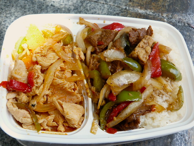 The winner of the two dishes for me was the vegetarian eggplant dish with “duck,” fried tofu chunks, onion and peppers in a peppery, spicy garlic sauce. The chicken suffered from being white meat and also from its sauce which tasted nothing of sriracha, but instead contained the flavor of tomato (and a couple of actual chunks of tomato) along with sliced carrot, onion and red pepper. It was a strange combo that didn’t quite work for me, but perhaps some of you would like it.