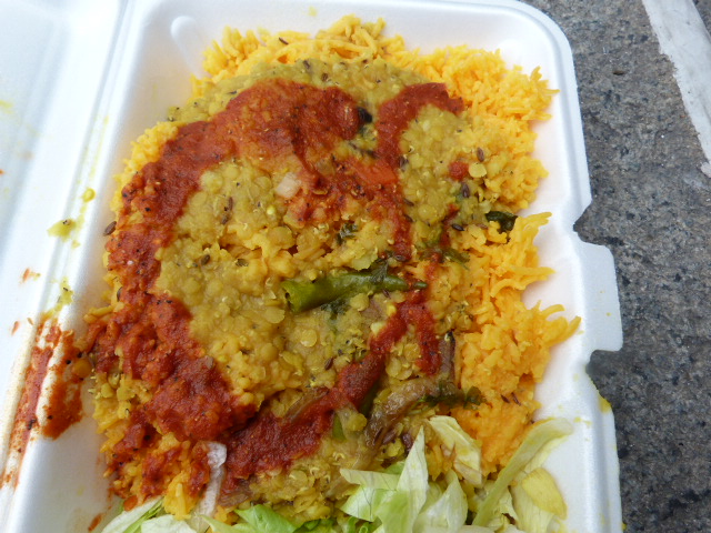 The main problem with my lunch was that the watery dal almost completely blended into the yellow rice underneath. I wish they put it in a small cup on the side or perhaps served a lentil curry instead. It was tasty, but not as hearty as chicken or falafel over rice. That being said, I was reasonably full after my $4 lunch, but I probably wouldn’t get it again as it wasn’t overly flavorful.