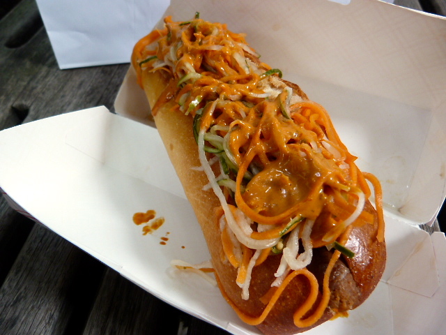 I was torn about what to order, so the workers helped me out by offering suggestions. When one said she liked the Moroccan sausage (merguez with harissa hot chili sauce, cucumber and curry ketchup) with the toppings of the banh mi dog (jumbo hot dog with pickled carrots, shredded cucumber, daikon, cilantro and jalapeño), I thought that sounded good and put in my order.