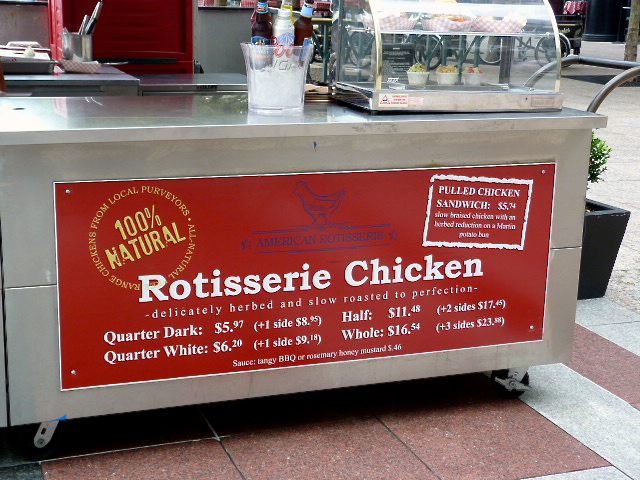 Now that the indoor food court is closed for renovations, the carts and food trucks that park outside daily have picked up the slack. I was surprised to see a crop of mostly new vendors among the carts alongside mainstay Quality Burger, among them hot dogs, tacos and rotisserie chicken. Check out my experiment with mixing a Moroccan sausage with Vietnamese sandwich toppings straight ahead!
