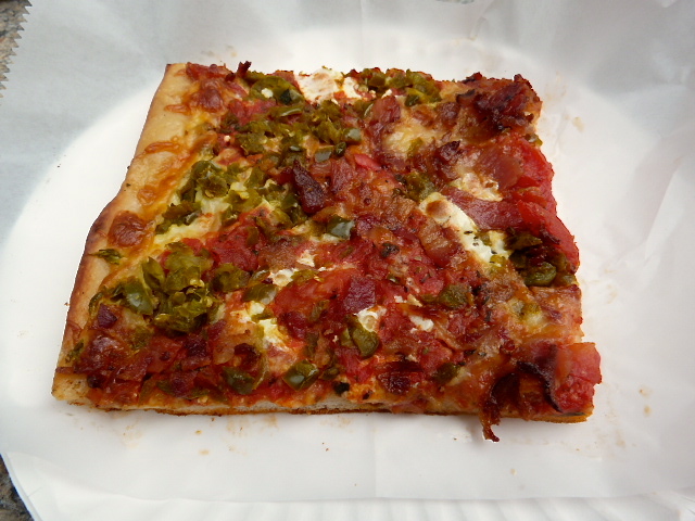 There were actually more square slices on display than round pies and they all looked delicious in my hungry state. I waited in the line out the door, and tentatively asked if they had the bacon jalapeno slice. To my delight, they did, and a slice was promptly shoveled into the oven. As I paid $4.25 for the slice, I thought to myself that this thing better be good for that kind of money.