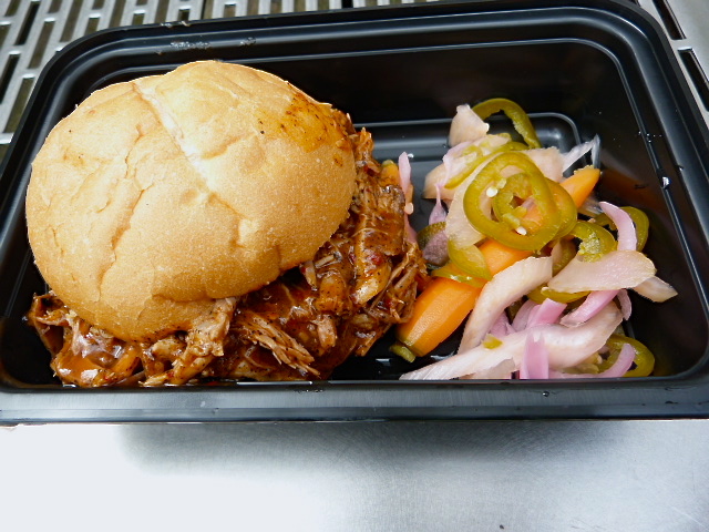 The sandwich was of a good size and contained so much pork I couldn’t pick this thing up without getting sauce all over my pants. That sauce was good at first – both sweet and vinegary with a pepper kick – but there was so much of it that after getting through half the sandwich I struggled to finish it because of the burn. You get a side of pickled carrots, onion and jalapeƱo, but that’s also spicy and does nothing to cool your mouth. My suggestion: Ask for them to go light on the sauce. From what I could taste of the pork, this would have been great without the spice overload.