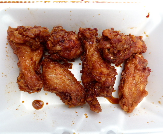 I asked for six wings ($6), but was given a half-and-half mix of those and drumsticks. You get a choice of soy garlic or spicy soy garlic sauces and I went with the regular version. It wasn’t quite as sticky and adhered to the crust as at places like BonChon, but it was also ready in a few minutes and cost less.