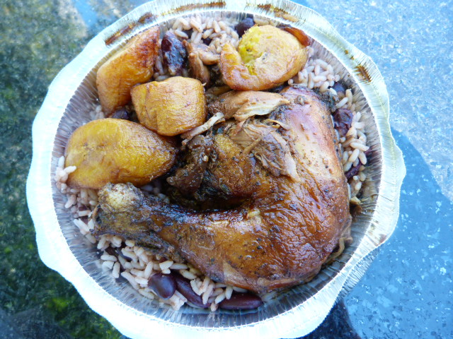 They have a pretty wide selection of the standard Jamaican/Trinidadian fare on a steam table including oxtail, stew or jerk chicken, and fried whiting. You can choose from three kinds of rice, and sides including stewed cabbage and fried plantains. There are two sizes – small or large – ranging in price between $5 and $9. I opted for a large jerk chicken with peas and rice and plantains ($7.75).