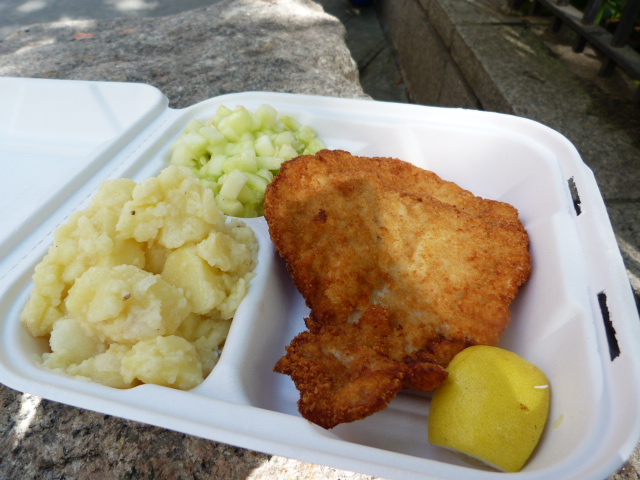 There are actually quite a few options at the cart including chicken, pork or eggplant schnitzel and bratwurst in either sandwich or platter form. I wanted to try some of the sides so I got a pork schnitzel platter ($10) with Austrian potato salad and cucumber salad. There were a whole lot of shades of tan in my container.