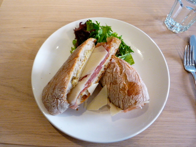 The inside of Barbalu is a small, bright dining room, and the space next door that used to be the market and takeout area is being renovated. You won’t have trouble finding a seat at lunch, which I appreciated, and it’s easy to have a conversation. I took a look at the sandwich menu of which there is a nice selection of both meat and vegetarian options. I opted for the prosciutto di parma, parmesan and artichoke pesto variety and it came with a nicely-dressed little salad.