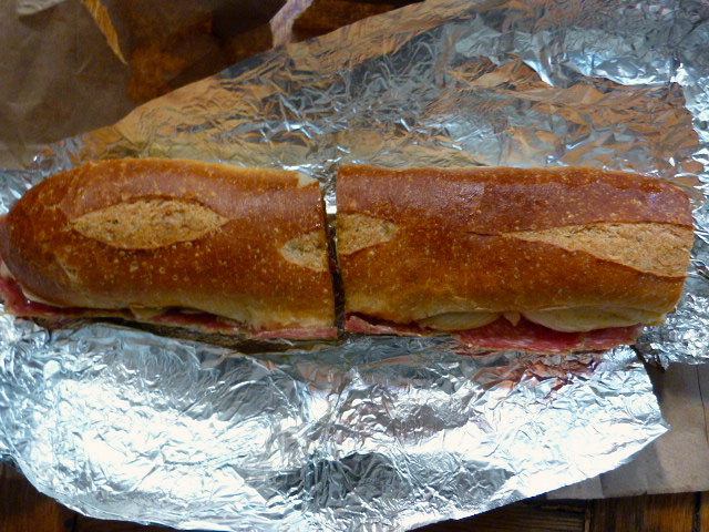 Most of the sandwiches cost $10 or more depending on what meat and cheese it contains, but you’ll find that they are humongous and can easily be shared between two people. I ordered the “Catanzaro” sandwich ($9.90) that contains soppresata, smoked mozzarella, hot pickled peppers and hot spread, which is a spicy giardiniera. You can get it on white or wheat bread or pay extra for semolina, sfilatino or ciabatta.