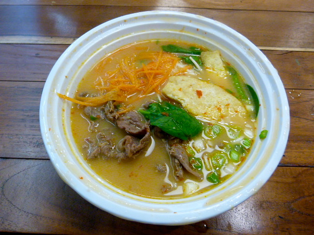 My choices were beef in spicy broth with the default toppings of scallion, mushroom, carrot, and baby spinach. A couple of dried strips of tofu were thrown in as well. The good news is that the broth and noodles were really good. The noodles had a good bite to them and avoided the downfall of getting mushy in the broth and falling apart when you try to eat them with chopsticks. The broth was surprisingly rich, actually spicy, and ended up being the best part of the soup for me. Another high point was a beef, which had been marinated so it was tender, and I didn’t even care that it tasted more Korean than Japanese.
