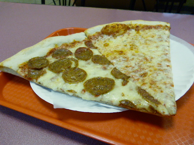 There was a line of people who mostly looked like office and construction workers when I stepped in, which is always a good sign. I surveyed the slice options and while there were some square and many round, not all of them looked appealing. There was also less of a selection of specialty slices than I’m used to, with a barbecue chicken and chicken with broccoli about as interesting as things got.