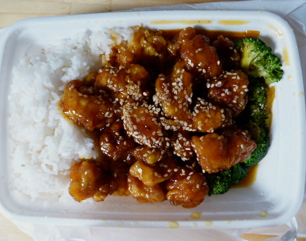 The lunch special is your choice of dish with white or yellow Mexican rice for between $5 and $5.75 depending on whether you go vegetarian or not. Regardless, those prices are a deal for this area, even if you don’t get crappy soup or a leaden egg roll with it. I ordered up a standby of sesame chicken with white rice and it was cooked and in my hands within five minutes.