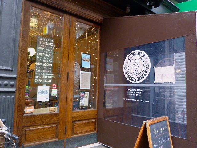 The name of the restaurant Aux Epices on Baxter St. (btw. Canal & Hester) translates from French into “with spices” and that was an accurate description of the riot of flavors in my lunch there. It moved from Tribeca where it was called Franklin Station Cafe, and there isn’t much on the lunch menu that tops $10, but you have to remember that this is Chinatown/Little Italy and that price point is expected. You don’t feel like you’re eating in the neighborhood as you step inside and black and white photos paired with cute cafe tables and French music contrast with the mostly Malaysian and Asian dishes on the menu. It’s a nicer lunch experience than you might find in surrounding establishments, and the seafood dish I had was delicious.