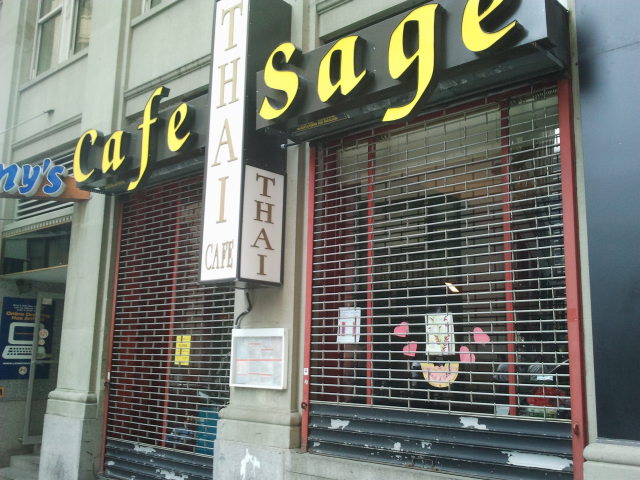Cafe Sage had the shutter partially down on Friday afternoon, and apparently I wasn’t the only who noticed that the Thai restaurant on John St. was closed. A tweet from a downtown lunch’er alerted me that there was a yellow Department of Health sticker affixed to the restaurant. Sure enough, according to the DOH Web site they were shuttered with 40 violations included presence of mice and roaches. Suddenly, eating from that quick and cheap lunch steam table they were popular for isn’t sounding so great.