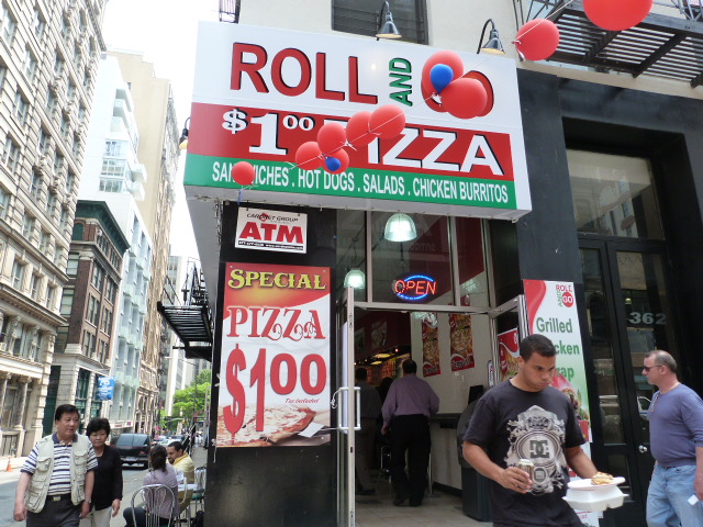 Since we don’t have 2 Bros. Pizza way downtown the $1 slices that are common in other parts of the city are something of a novelty here. The newly-opened Roll And Go on Broadway (at Franklin) is the only place I’m aware of (other than craptastic Papa John’s) below Canal selling slices at this price. When I got there the place was packed, but since almost everyone was getting cheese slices they had a bunch ready to go and it wasn’t long before I had food in hand.