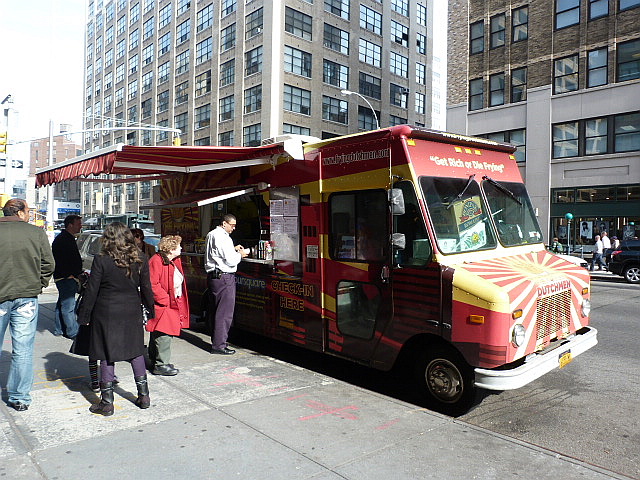 When the Frying Dutchmen truck first launched they only sold one item: Belgian fries in either regular or sweet potato varieties. The hook was they had a bunch of dipping sauces, but as I discovered, although their fries are delicious it’s hard to shell out more than $5 for fried potatoes. A while later they added chicken wings to the mix, then some chicken sandwiches and the latest innovation is burgers which naturally go very well with fries. They used to park in the Financial District a lot but either due to parking issues or lack of interest they’re largely found elsewhere these days although they do stop in Soho at least once a week (they’re at Varick & King today). That’s where I caught up with them to see if their other food offerings were any good.