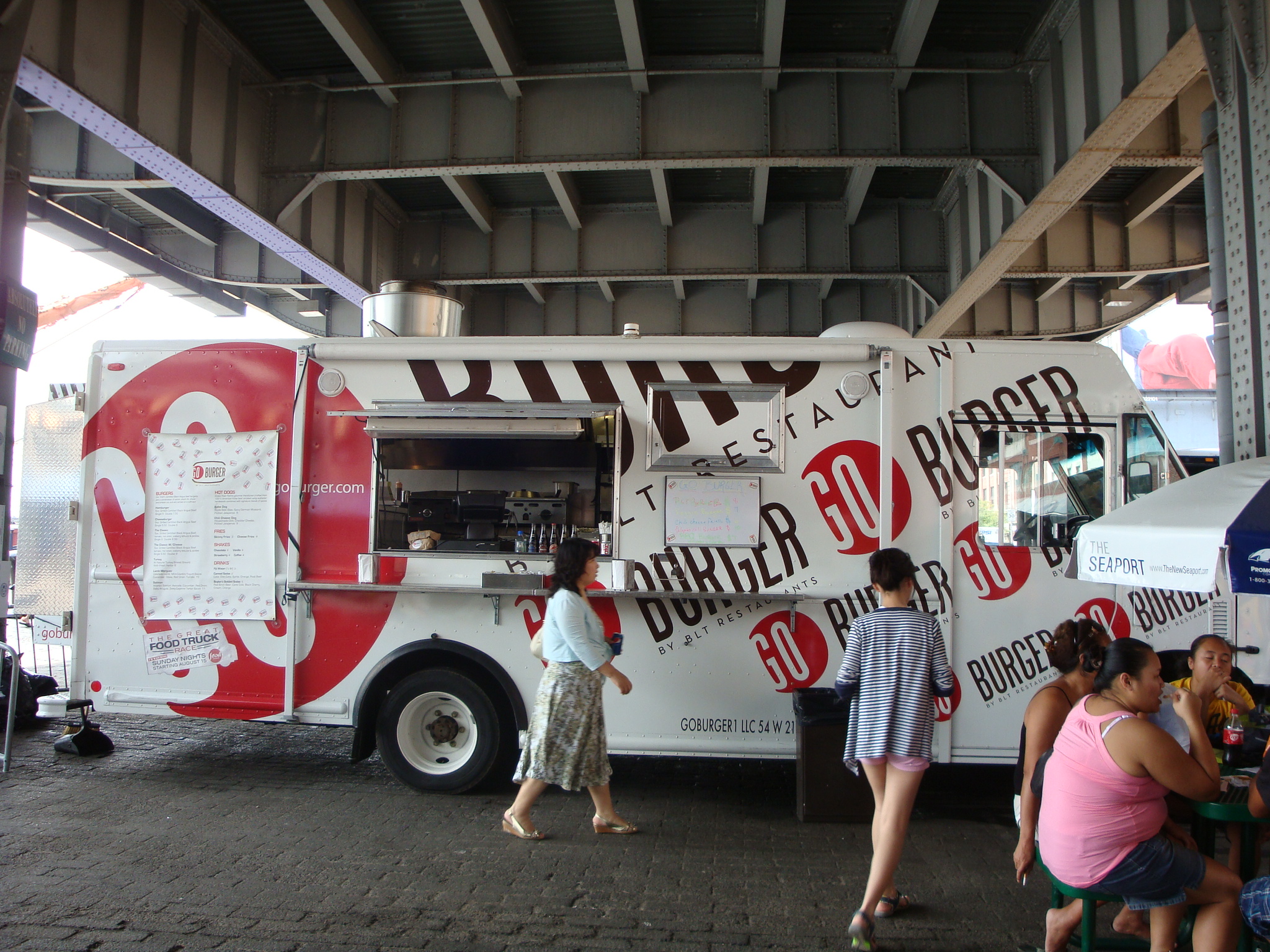 The Go Burger Truck debuted a while ago and is parked semi-permanently on Front St. at the South Street Seaport, and to be honest I really had a hard time drumming up enthusiasm. You might say that I have reached fancy burger fatigue, and also, I was having a hard time wrapping my brain around a $5 (single, unadorned) hamburger from a truck. It doesn’t help that much like the La Cense Burger Truck (which incidentally, is parked a few blocks away at the end of Wall St.) it’s essentially a billboard for a product, which in this case is the BLT restaurants. I had an even harder time drumming up excitement after a Five Guys opened just a short walk up Fulton St. Then there was the, shall we say, “scathing” review on Blondie & Brownie in which the food was so bad it ended up in the trash.
