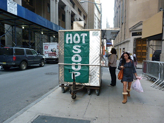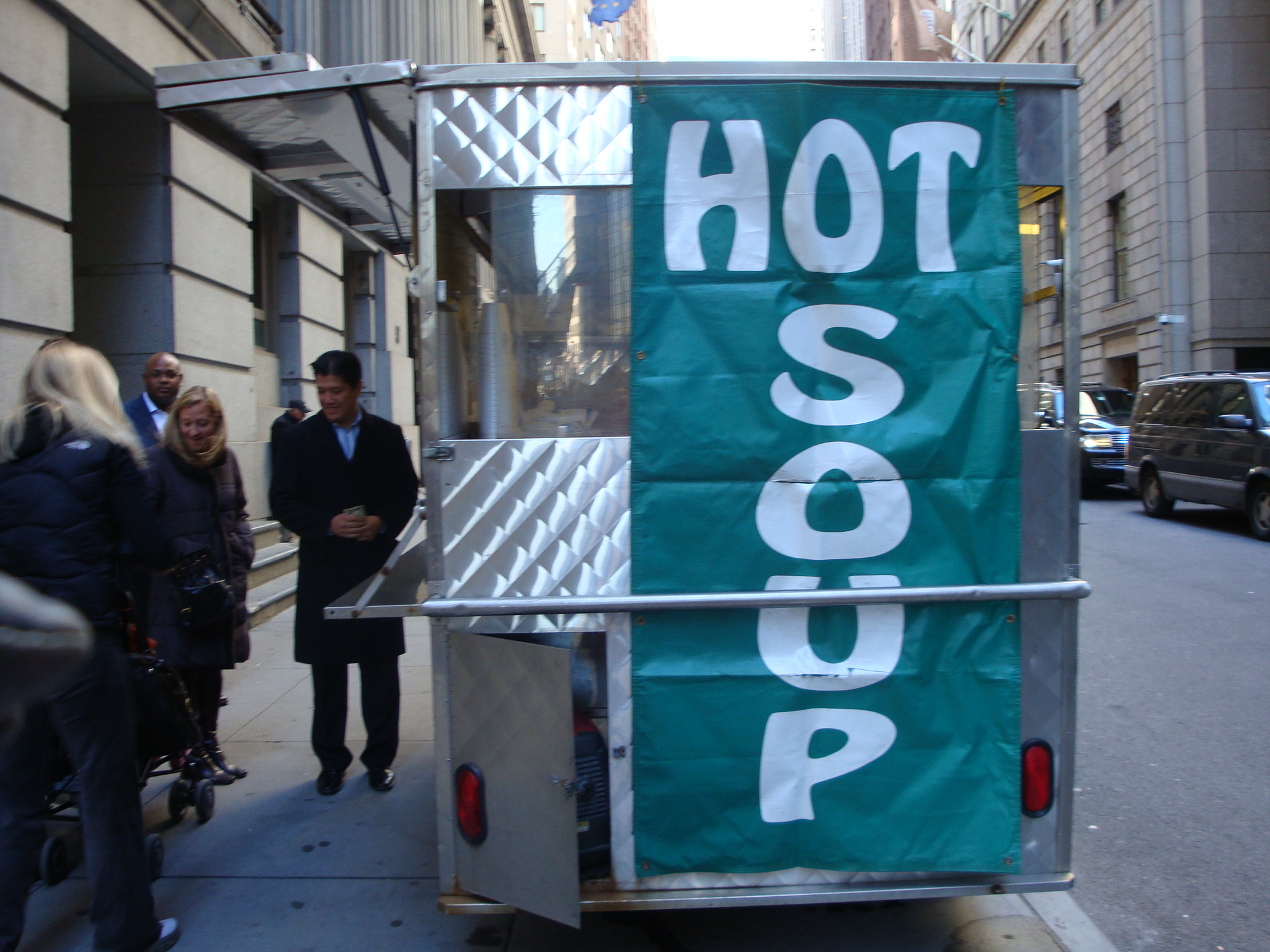 Just like UGG boots and being thankful for the gross heat from the subway trains, winter means the return of the Hot Soup cart to Wall St. I spotted it yesterday between William and Pearl streets which is about where it’s normally parked. It looks like the prices are up from last year to $5 for a medium and $6 for a large which is close to approaching Hale & Hearty territory.