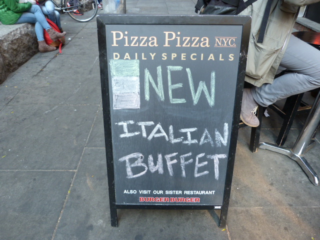 There’s an interesting new by-the-pound buffet option in the Financial District at Justino’s Pizzeria (formerly Pizza Pizza) on Pearl St. (nr. Stone). Why is it interesting? Because it’s $6.95 per pound and from the quick scan I made during lunch yesterday it looked like there weren’t a lot of scale-friendly options. There were a couple of kinds of pasta, a baked dish with cheese on top, broccoli, sliced Italian bread and then a few tureens off to the side that I’m guessing were soup. Pasta and broccoli are not the lightest of items, so it wouldn’t be hard to spend $10 or more here if you’re really hungry. It might be a hard sell when you can get a couple of plain slices there for $5.