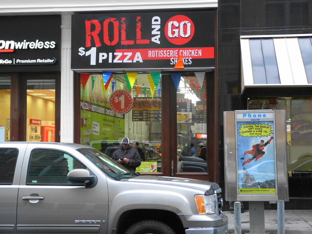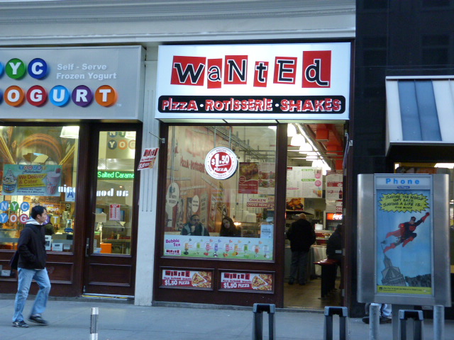 It was a little surprising to see a new awning and name on the space where pizza/rotisserie chicken/shake emporium Roll And Go was. Now it’s called Wanted and you’ll have to pay $1.50 for a slice instead of $1. I’m not sure if the whole chain was renamed or just this location, but we’ll see if the price hike (and kidnapping-inspired signage) will lead to less of a line out the door at lunch.