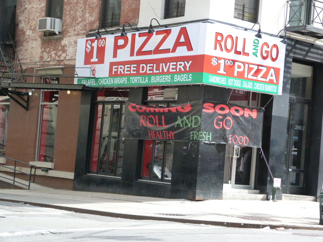 About a month ago, signage went up on a location of Roll And Go on Broadway (at Franklin) advertising $1 slices and an odd assortment of other food options. Well, according to lunch’er Geaufrite in the forums it looks like it’s finally open and we can all get our grubby hands on cheap-ass pizza. Since that’s kind of a lunch dead zone it’s probably best that this opened instead of yet another Subway.