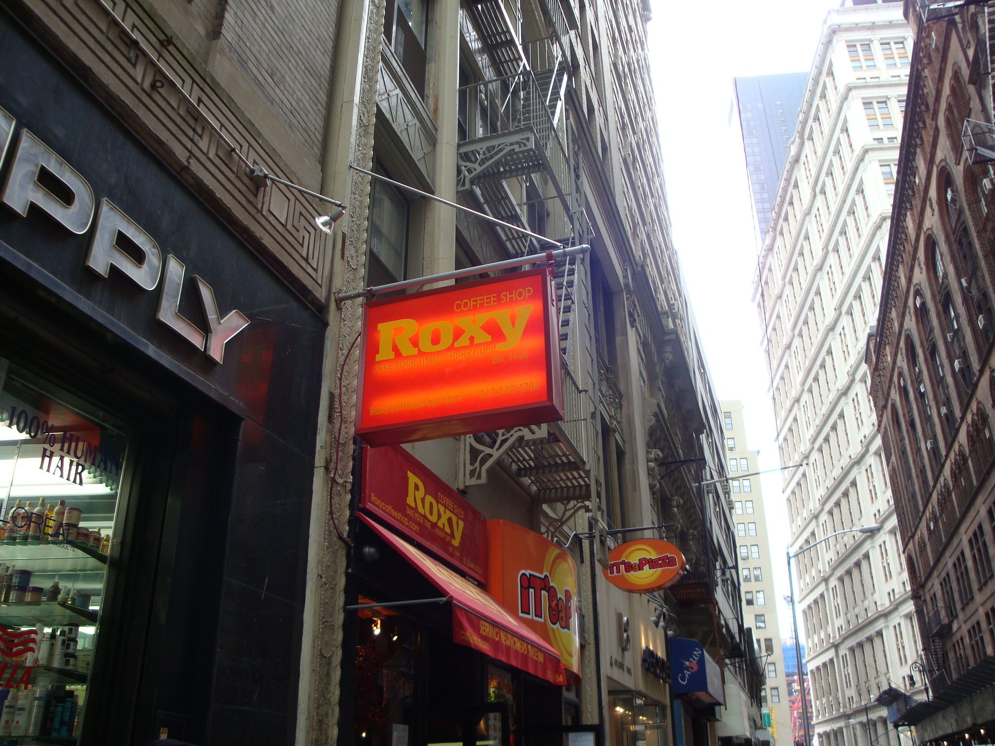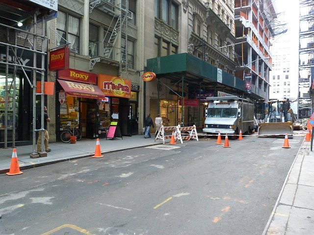If you work near the Fulton St. Transit Center construction area, you probably know it’s a nightmare trying to walk around with streets torn up and sidewalks narrowed, but on John St. there are also a bunch of other building projects going on. Unsurprisingly, it’s affecting businesses in the area, including the old-timer Roxy Coffee Shop on the block of John btw. Broadway & Nassau. It’s been there since 1944, was renovated a couple of years ago, and sits next to one of my favorite sources of pizza in the area, It’s A Pizza which I’m guessing has also lost business. As noted in the forums, a neighborhood resident talked to the owner of Roxy’s about how the construction was affecting business, and what he found out wasn’t good.