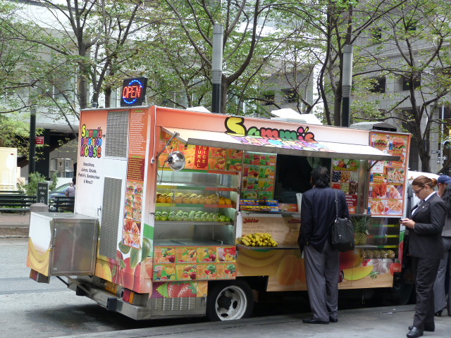 I can’t really think of many places where you can get a juice smoothie with a side of chicken nuggets and fries (that’s not McDonald’s). Sammi’s Nutrition House truck fills that void, allowing you to add nutrients to your body with fruit juice, and then get your recommended daily allowance of sodium with a plate of street meat. I noticed that since the truck first appeared in the Financial District they had added some other specialties to the menu including chicken tikka and biryani and was curious what they were serving up.
