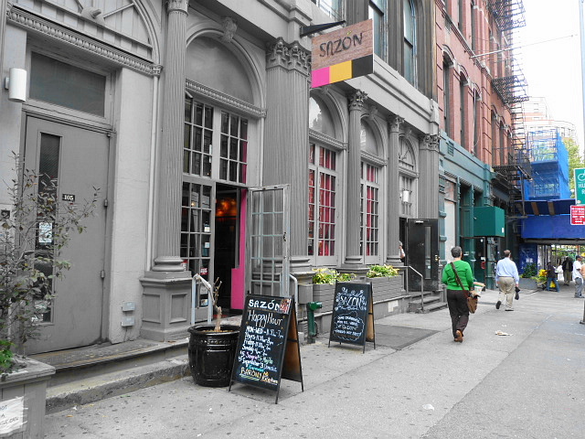 There aren’t a lot of Puerto Rican food options downtown unless you count Sandra’s Food Spot Cart on Nassau St. in the Financial District, or lump West Side Coffee Shop or Sophie’s Cuban together in that vague category of “Latin food.” There is, however, Sazon on Reade St. (btw. Church & W. Broadway) in Tribeca. Yes, it’s a fancy take on Puerto Rican food, but the lunch menu has a few options at the $10 or below mark. I decided to try out their take on the jibarito – the sandwich with fried plantains in place of bread – and was pretty happy with what I got.