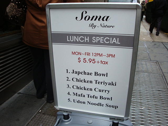 I am sick. Sick as defined by Nyquil (I’m not getting any money from these people, but I love this shit), that is with sniffling, sneezing, coughing, aching, and fever. I did not want to come to work, but deadlines were looming overhead and duty called. So when lunch rolled around, I was looking for something that was gonna make me feel better. Normal people might think chicken soup, but for whatever reason, not me. Nope, my first thought was “I need to get me something spicy, something hot, something that’s going to make me forget that I’m sick.” So stumbling down the street I saw Soma By Nature [sic] on William Street, a Korean/Japanese place I’ve been to a couple times, and couldn’t help but wander inside to see what they had to burn my face off.