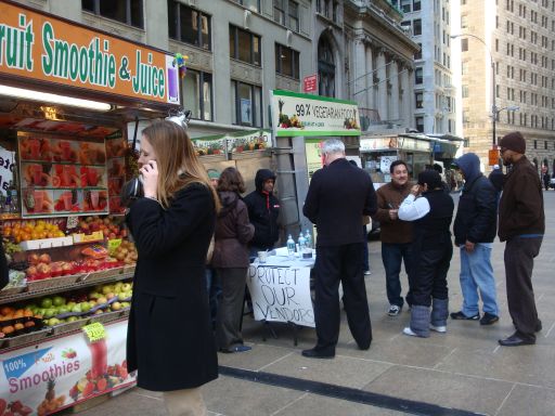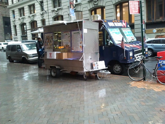 I spotted this yesterday when I was walking back from lunch: One of those fruit/smoothie vendors blocking everything but the window of the Our Heros truck at Wall & Water streets. I’ve seen them both parked there before, but never this close to one another. I guess it’s nice that they learned to co exist…