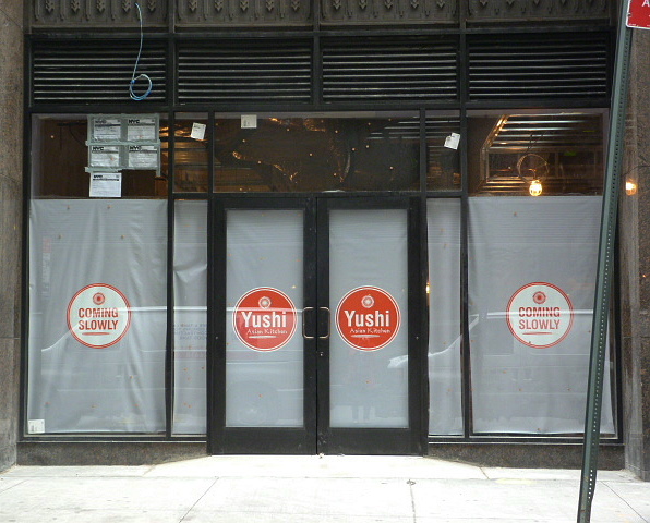 While walking by the “coming slowly” location of Yushi on Pearl St. (btw. Maiden & Cedar) yesterday I noticed signs were up, and although the windows are still papered over there were people coming out who looked like they were there for training. We’ll try to keep you posted on when they’re opening, but if any of you see the doors open and Japanese food coming out, let us know!