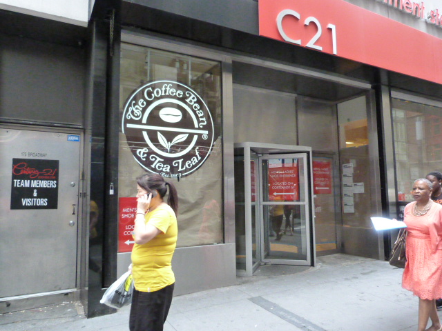 The giant Century 21 department store on Broadway btw. Cortlandt and John streets added a spot to get a caffeine fix during their ongoing renovation. A lighted sign for Coffee Bean & Tea Leaf materialized at entrances on Broadway and also on John St. I’m guessing they only offer liquid refreshment and not much in the way of food, but if you are curious about the chain spot, it may be worth battling all of the tourists within Century 21.