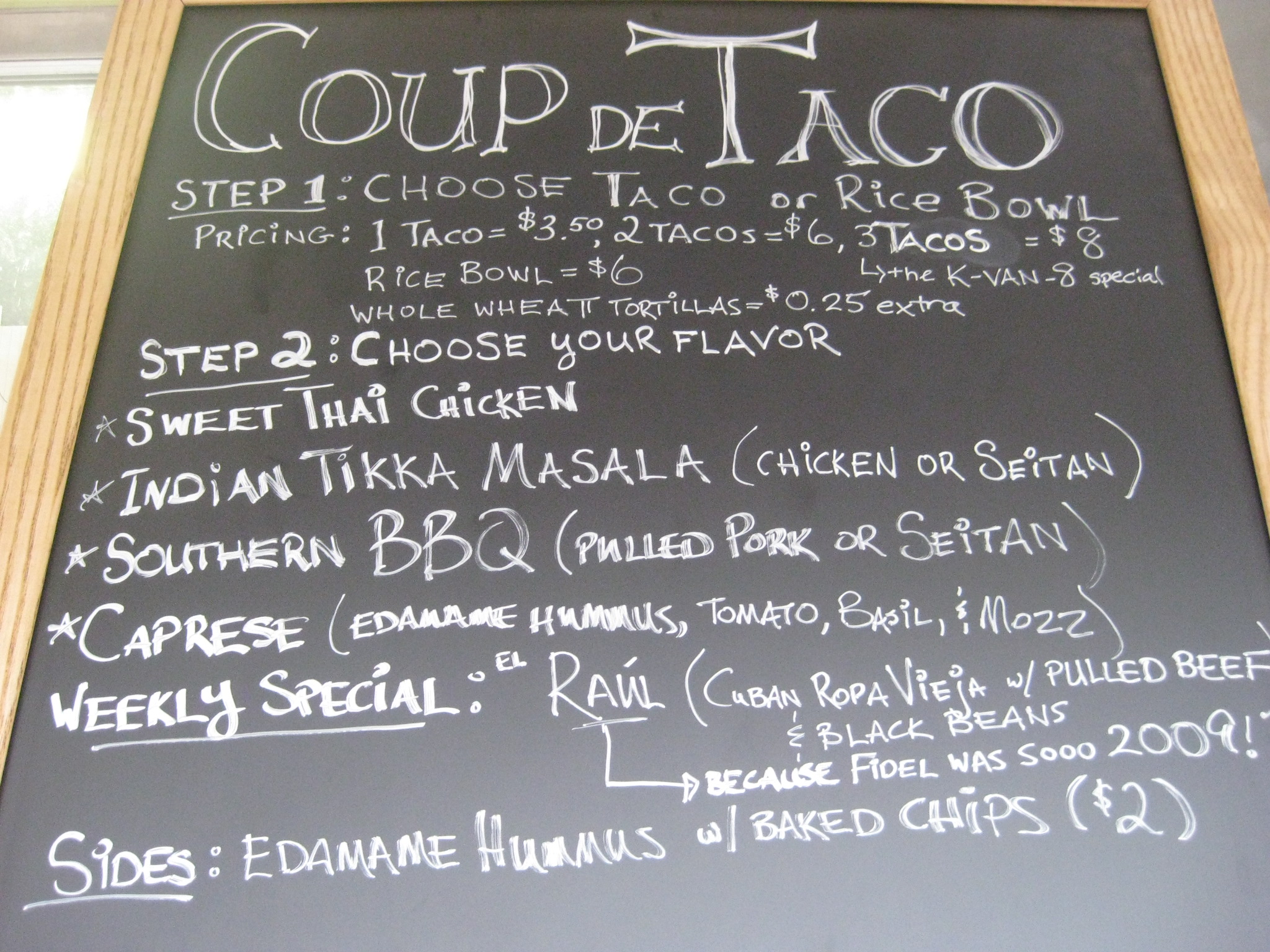 Coup de Taco opened over in University City last fall. Everyone loves a food truck, especially when the food they serve is unique. Coup de Taco had a good gimmick going, but it goes beyond that. The atypical taco fillings are very well done. The three original tacos were Sweet Thai Chicken, Indian Tikka Masala, and Southern BBQ, then the Caprese was added, and now they have Raul as a special.