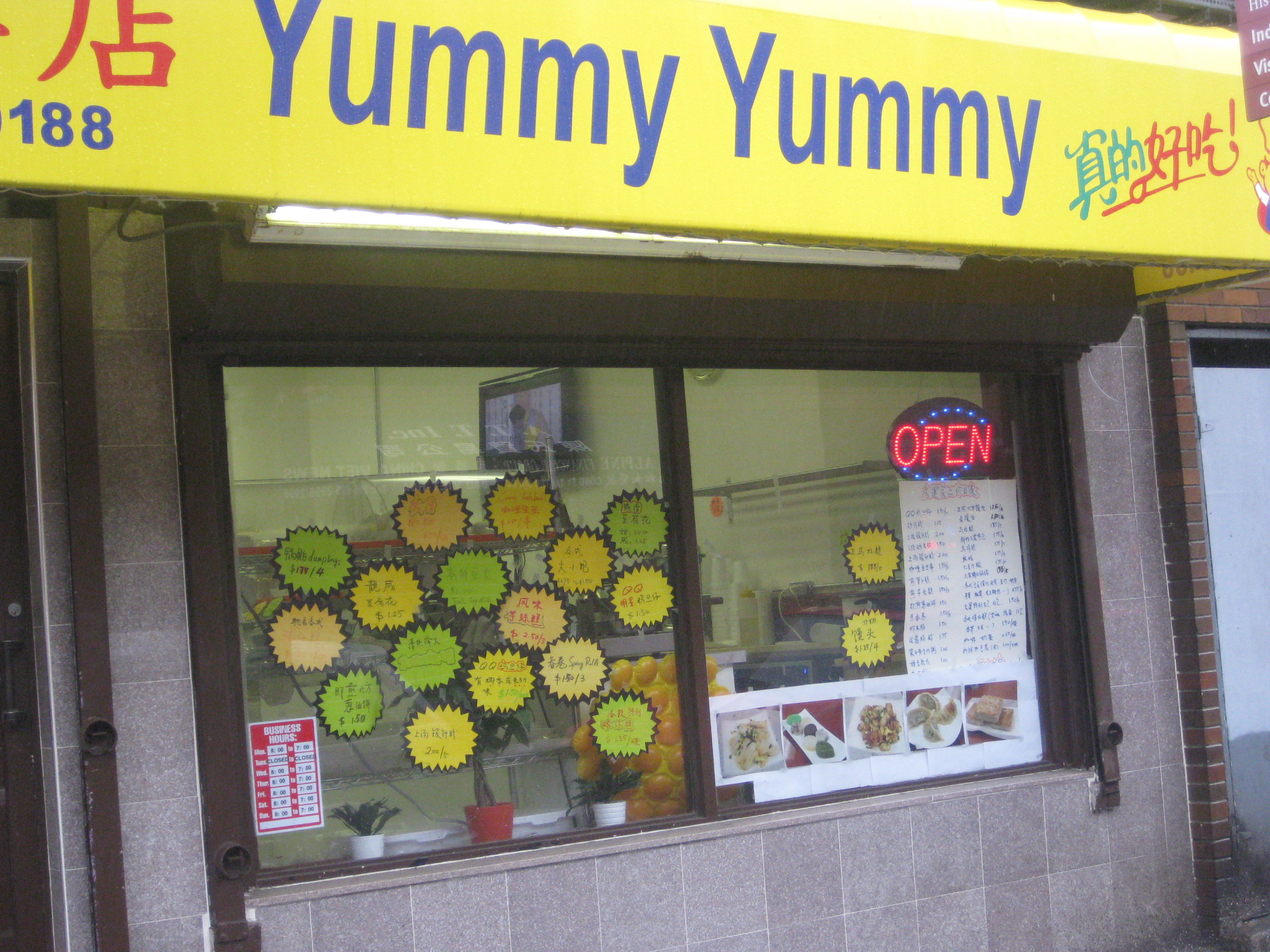 Yummy Yummy gets dumplings and other snacks from the Chinatown Noodle Factory across the street. All of the small dishes are packaged to make transporting them easy. If you are lucky, you can catch them while they are hot. Otherwise, reheat in the microwave using the wet-paper-towel method* so nothing dries out.