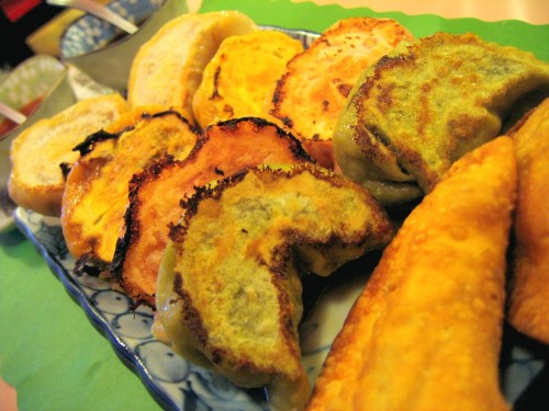 I relished in discovering the flavors hidden within these little treasure pockets and took my first bite into the green, spinach-extract-tinged, vegetarian dumpling. The flaky consistency of taro and the subtle hints of mushroom, tofu, and green bean vermicelli were juxtaposed by the succulent, mustard-flavor of the napa. As for the dough, it was thicker than what I was accustomed to, but delightfully chewy in the way that only a hand-rolled dumpling skin could be.