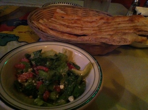 Lunch entrees come with small salads, either plain cucumbers, Afghan Salad, or Greek Salad. The Greek salad, we were told, is like Afghan salad but with feta, so clearly that is the one to pick. Long, chewy Afghan bread is also served and I used it to dip up the sauces from my appetizers.