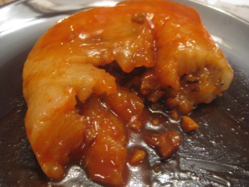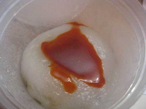 This is really unusual, and unlike any other meatball or dumpling. For $3.50 you get a ball made with a rice flour outer layer stuffed with mushrooms and pork. This is definitely one of the least attractive plates I have had to photograph. It’s appearance offends my camera. Especially when I added the sweet tomato sauce and cut it open.