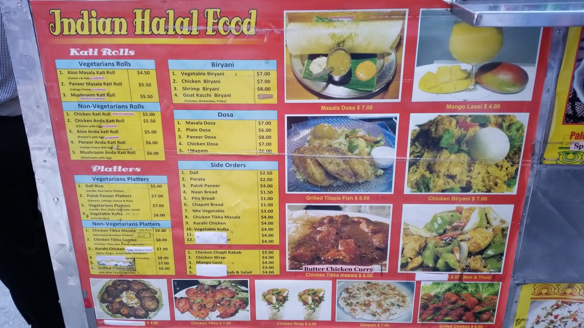 The fairly extensive menu – I mean, for a cart to have so many things on offer is pretty impressive. I spotted “butter chicken curry” pasted above the line “chicken tikka masala” and asked my friend, “Why does that not look like butter chicken?” and his response “because that’s chicken tikka masala” should not have satisfied me. I ordered butter chicken.